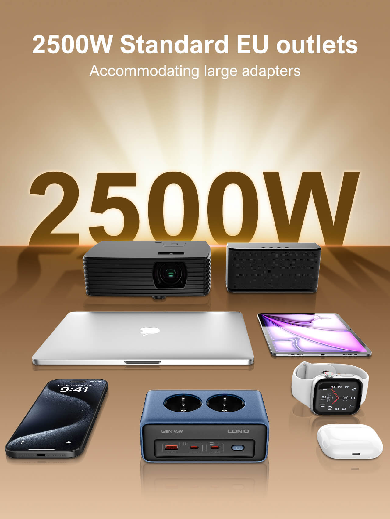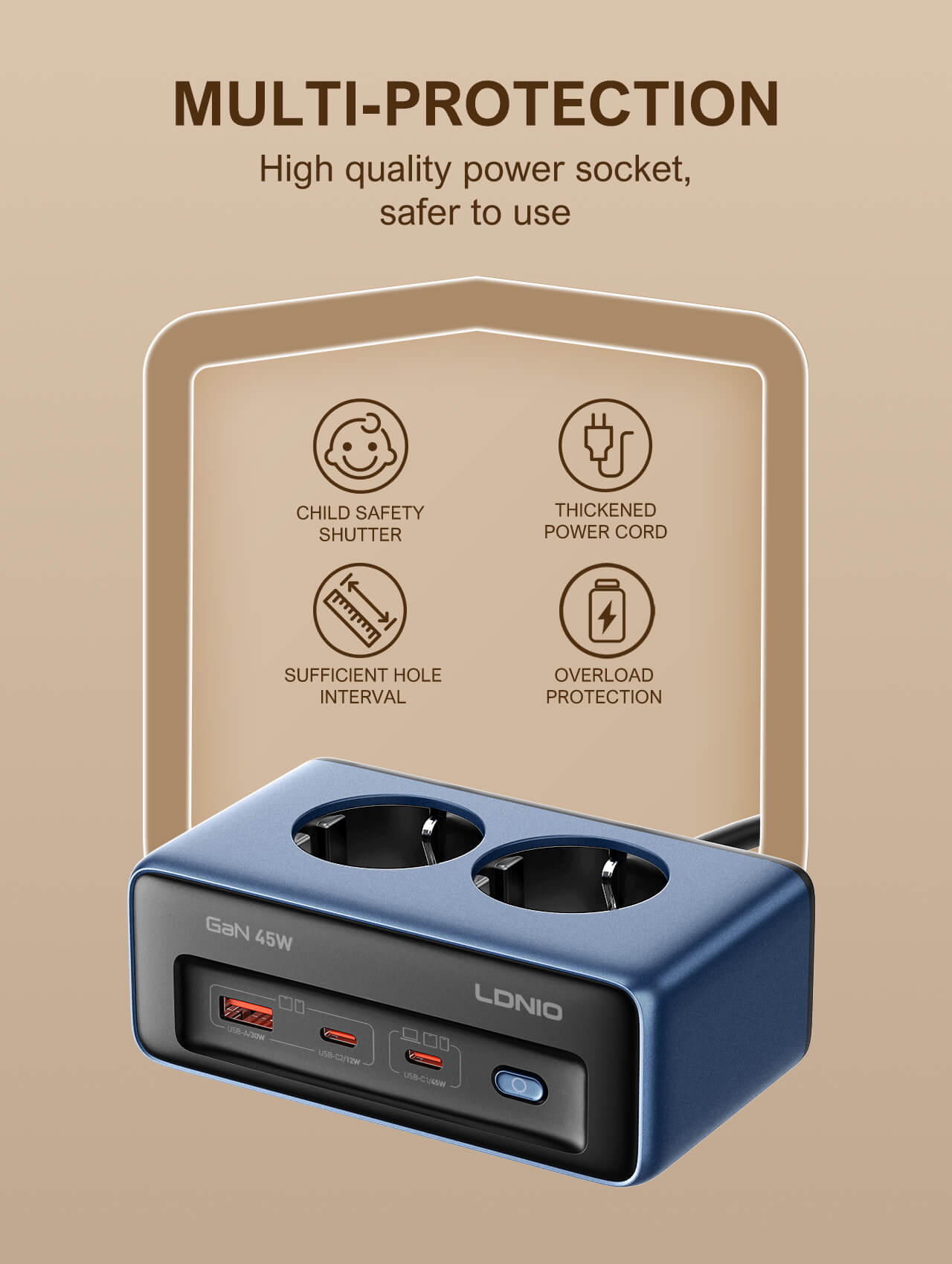 *به طور همزمان به محافظت از چندین دستگاه الکترونیکی کمک می‌کند و در عین حال آداپتورهای بزرگ را نیز در خود جای می‌دهد.